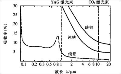 鋁及鋁合金的激光焊接難點在于鋁及鋁合金對輻射能的吸收很弱,對CO2激光束(波長為10.6m)表面初始吸收率1.7%;對YAG激光束(波長為1.06m)吸收率近5%。圖3為不同金屬對激光的吸收率。